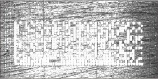 鋳肌表面は全体に凸凹があります。ワークの印字表面を拡大すると、セルがマーキングされた部分でも、鋳肌表面の凸凹の影響により、明るく光るところと黒くなるところが発生します。同様にセルの周囲にも濃淡が発生します。