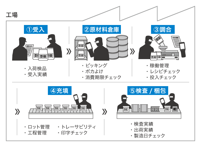 食品・薬品・化粧品の場合、原材料の取り違えによる調合ミスが起きる可能性があります。ハンディターミナルを活用すれば、調合前にバーコードを読み取り、原材料やレシピの確認が可能です。また、全体の稼働管理やレシピチェック、投入チェックがリアルタイムで行えるので、問題があればその場で対応でき、後工程の停滞を防ぐことができます。そのほか調合時に賞味期限を確認したり、消耗品や設備の状況を管理したり、製造に関する多くのものを紐づけて管理できます。