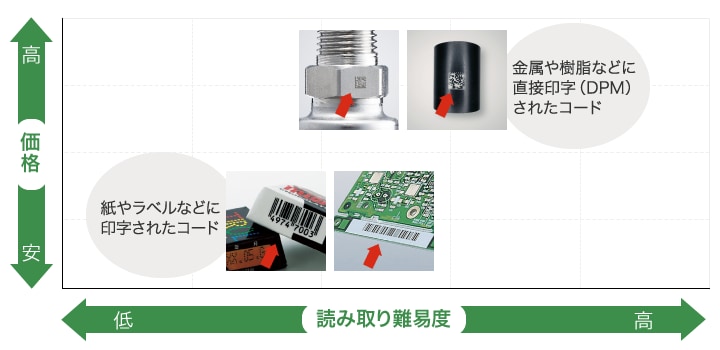 昨今、トレーサビリティの強化により、金属や樹脂(プラスチック)製などさまざまなワークへの直接印字(DPM:ダイレクトパーツマーキング)の採用が増加しています。一方でDPMでは、ワークの素材や形状により印字精度やコントラストが低下する場合があり、読み取りの難易度は高くなります。そのため、ハンディターミナルにおいても、直接印字コードの読み取り能力への要求が高まってます。