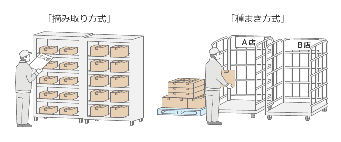 摘み取り方式は、発送先毎に商品を集め、出荷する方法です。「シングルピッキング」「オーダーピッキング」とも呼ばれ、通信販売など発送先が多く、多種多様な商品を出荷する場合に採用されます。メリットは、発送先ごとに柔軟に対応しやすく、梱包後すぐに出荷できることです。