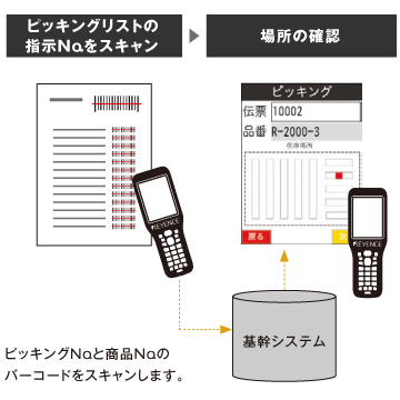 事前に品物とロケーション(棚・列・段)を登録しておき、出荷指示書(ピッキングリスト)にバーコードを記載しておけば、作業者はハンディターミナルで読み込むだけで品物の情報と正確な位置を知ることができます。そしてピッキングする際に品物のバーコードを読み取ることで同時に検品もでき効率的です。また、商品管理の観点でも入出庫管理が確実に行え、正確な在庫管理が実施できます。