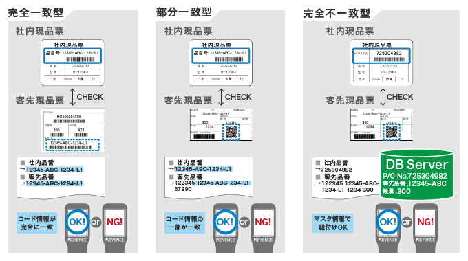 ハンディターミナルを使うことで、社内現品票や客先現品票で品番が変わる場合などのケース(完全一致型・部分一致型・完全不一致型)でも、柔軟に対応できます。