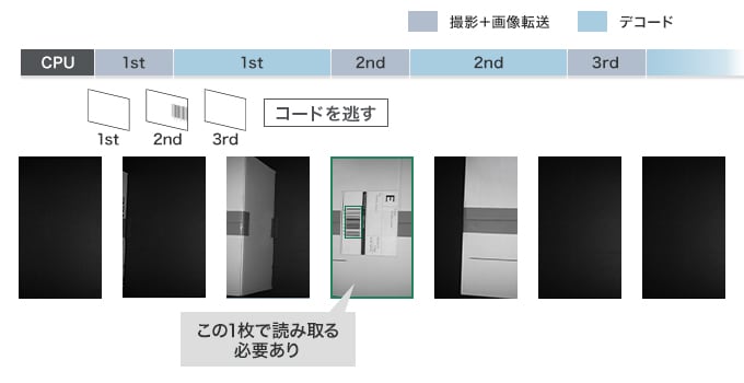 ケース2:撮像とデコードを同時進行させても、デコードに時間がかかり荷物の搬送スピードに間に合わない。