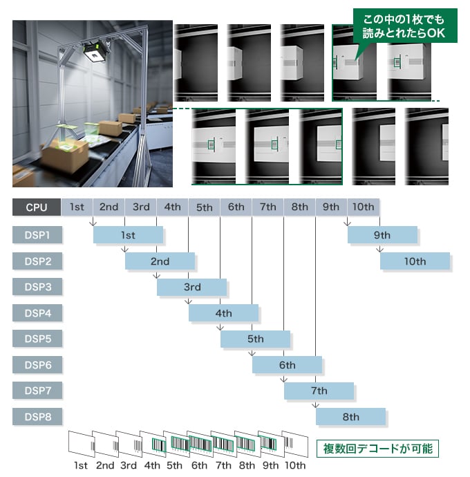 「SR-5000シリーズ」は、この複数並列処理により、ラインスピードを上げてもコード逃しやエラーの発生を回避します。それにより、インラインでの安定した高速読み取りが実現します。