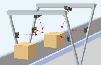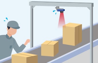 物流向けコードリーダ「SR-5000シリーズ」なら、コンベア上のさまざまな荷物のコードを安定して読み取ります。超広視野・超深度を実現し、荷物のサイズ(コードリーダとコードの距離)が異なる場合や、バーコードの位置がズレている場合でも、1面につき1台で安定して読み取り可能です。