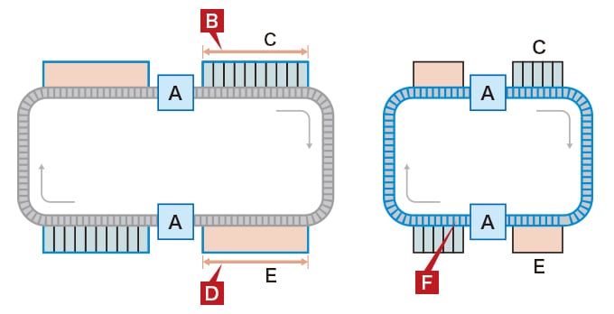 ライン上のコードリーダの読み取り能力が向上すれば、読み取りに必要な距離を短くでき、コードリーダをコンパクトに設置できます。たとえば、下図のようにシュートや投入台のスペースを増やして仕分け能力を向上させたり、仕分け能力を維持しながら、コンベアラインを短くすることが可能になります。庫内ラインの効率化は、効率向上や省スペースなどでコスト削減につながります。