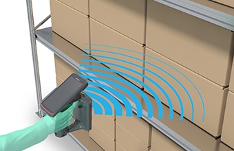 専用タグ(RFタグ/ICタグ)のデータを非接触で読み書きできる、RIFD(Radio Frequency Identification)は、対応範囲内であれば複数の専用タグの一括読み取り・書き込みが可能です。通信距離が長く、障害物があっても読み取ることができます。たとえば、複数の製品が1つの箱に梱包され棚に格納されていても、その箱が置かれた棚にリーダライタをかざすだけで箱の中の複数の電子タグをすべて読み取ることができます。これにより、作業を大幅に効率化できると同時に、これまで箱を開けてコードを1つずつ読み取る際に生じやすかった、読み忘れなどのポカミスを未然に防ぐことができます。