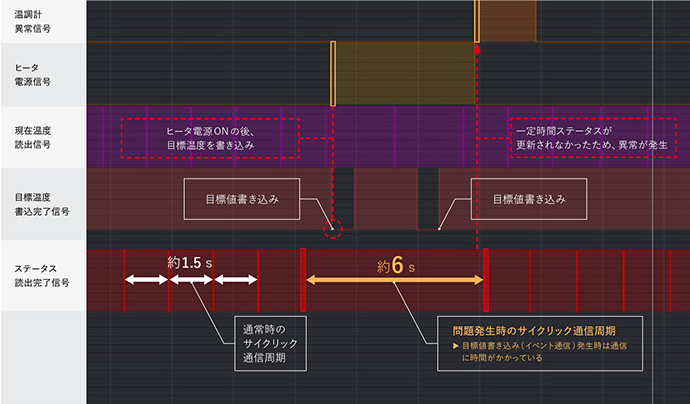 詳細に見ていくと、目標温度を設定するイベント通信が実行された際に、サイクリック通信のステータス読出が遅れることが原因とわかった。