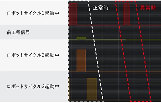 前工程からの信号が入らず、ロボットサイクル2の開始条件が揃わなかったためロボットサイクル2に移行せずにサイクルタイムオーバーが発生。