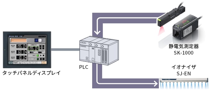 また、イオナイザと静電気測定器をPLCに接続することで、静電気の状態監視とイオナイザの設定調整を一括で管理できます。