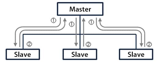 CC-Linkはマスタ・スレーブ方式のネットワークです。リンクデバイスや通信制御は、マスタ側で集中管理し、スレーブ側での設定は不要です。通信機能には、一定周期でデータを更新するサイクリック通信機能と、任意のタイミングで更新するトランジェント伝送機能があります。