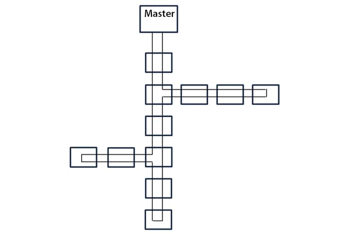 5線のツイストペア、または光ファイバーケーブルを使用して接続します。伝送速度は500kbpsまたは2Mbpsで通信しており、最大256局まで通信できます。全二重通信を使用して疑似的なループトポロジーを構成し、すべての機器に対して順番にデータを送信していく方式を採用しています。局間の距離は400mまで対応しており、総延長距離で12.8kmまで延長できます。