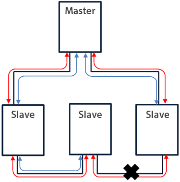 リング型で配線した場合断線検出時、別々のルートで通信することで断線による通信停止を防止できます。