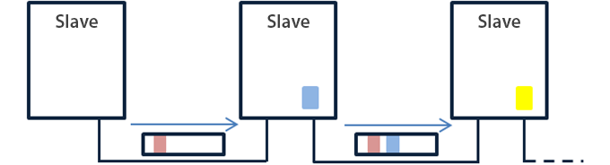 SERCOS IIIではマスタ・スレーブ間でデータを送受信する際に、マスタからスレーブ宛てのデータ領域と、スレーブからマスタ宛てのデータ領域がデータ内に用意されています。1つのパケット内で各スレーブの情報を格納し、データを共有することで、1サイクル内ですべてのスレーブの情報を共有できます。