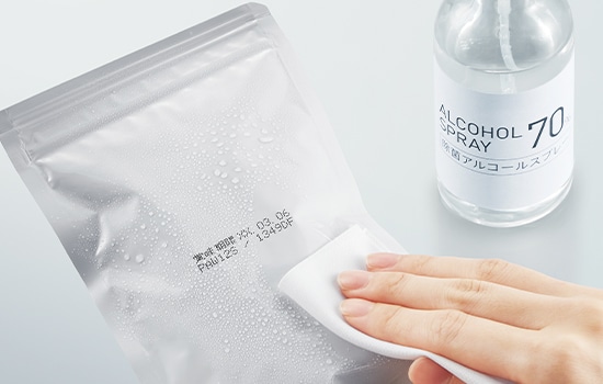 加えて、耐アルコール性であるため、製品出荷後に小売店の店員または消費者が、アルコール系消毒スプレーを吹きかけて、印字部分を拭いたとしても、印字がにじんだり消えたりする心配がありません。これにより、印字の保持と衛生面への配慮を両立することができます。