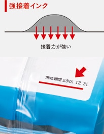 従来インクでは接着しにくかったポリ系樹脂などの材質にも適合するようにインクの接着成分であるバインダを改良。