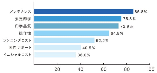 メンテナンス性と回答された方が80%を大きく超える結果に。逆に、イニシャルコストと回答された方が意外にも少なく、産業用のインクジェットプリンタはとにかくトラブルなく安心して使えることが求められているようです。