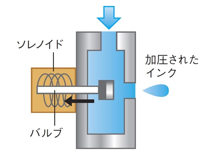 インク粒に圧力を加え吐出する方法に、ピエゾ方式とサーマル方式、およびバルブ方式があります。