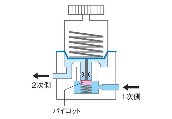 1次側の圧力はポンプにより変動します。そこで、減圧弁を使用して、2次側の圧力を一定に保ちます。減圧弁は流体の圧力を利用して作動する自力式圧力調整弁です。2次側の圧力が低い場合、パイロットが押し下げられ2次側へのインクの流量が増加し圧力が上昇します。逆に、高い場合は、パイロットが押し上げられ2次側への流量を止めて、圧力を一定に調整します。