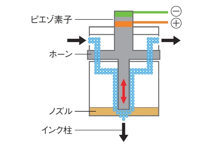 キャノンの内で、ホーンと呼ばれる円柱形パーツが上下に振動することにより、インク柱からインク粒を作ります。これを粒子化と言います。振動源はピエゾ素子と呼ばれる圧電素子で、電圧をかけると体積が変化する特性を利用して振動します。この素子をホーンに取付け、毎秒約7万粒のインク粒を作り出します。キャノンには供給する経路と回収する経路があり、運転中は回収経路を電磁弁で閉じてノズルからインクを吐出します。