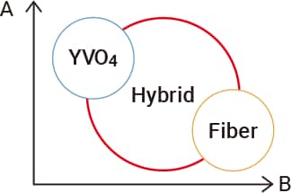 光ファイバーでレーザー光を増幅するファイバーレーザーに対し、YVO4レーザーはYVO4結晶でレーザー光を増幅する固体レーザーです。両者の違いは、ピークパワーとパルス幅にあります。※