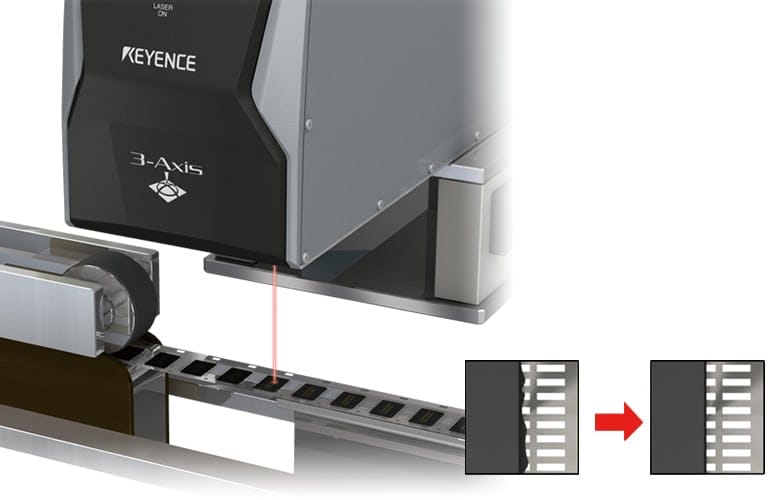 3-Axisレーザーの特性を利用して、ICチップTOP面のLOT印字と樹脂のバリ取りをひとつの工程で実施します。高精度にICの周囲のみをレーザーでスキャンするため、パッケージ内部へはダメージを与えずにリード部のフラッシュバリを除去できます。