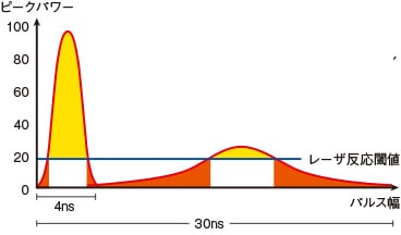 - ピークパワーが低く、パルス幅が長いレーザー(YAG、ファイバレーザー等)だと、ワークに対しレーザーが反応しない領域の熱が蓄積されてしまう。