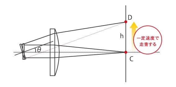 - 像高hと入射角θとの関係が、【h=fθ】になる様に設計されたレンズで、ワーク面上での走査速度が一定速度になります。周辺(スポットD点)では、速くなります。