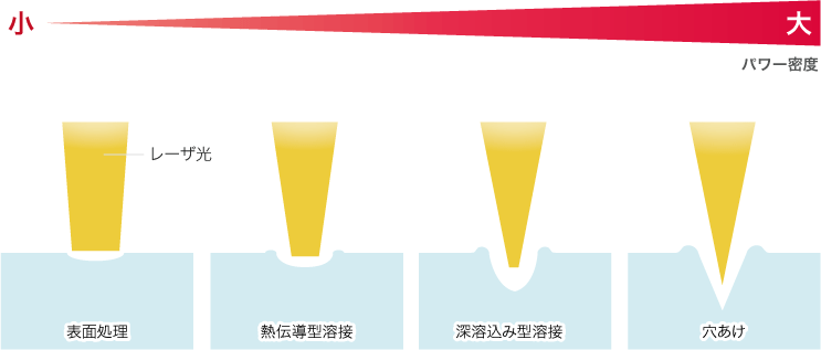 レーザー光は焦点や出力などを変えることで、溶込みの深さやビードの幅などを自由に変化させられ、様々な継手加工が行えます。
