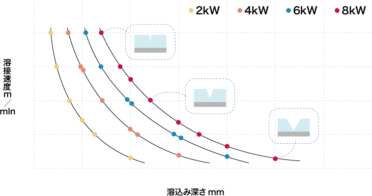 また、レーザーの出力や溶込み深さによって溶接速度も変化します。溶込みが浅くなれば溶接速度も早くなり、逆に深くなれば溶接速度は落ちます。レーザー出力が上がれば、溶込み深さと溶接速度は高くなります。