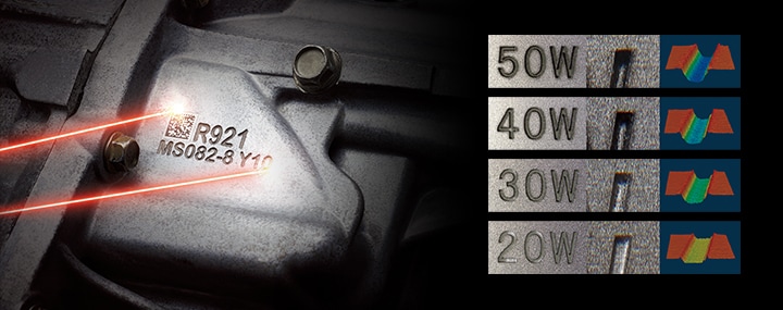 レーザー出力が高いほど、印字時間を短く、彫り込み量を深くすることができます。