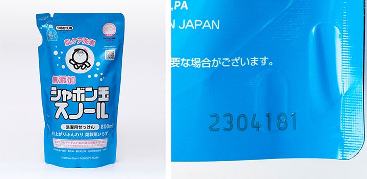 シャボン玉石けんのパッケージにUVレーザプリンタで日付印字をおこなっている。スタンドパウチの凹凸があるヒートシール部にもしっかり印字ができている。