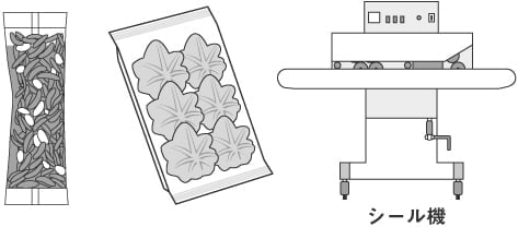 食品などの保存のために外気の影響を遮断し密封する機械です。シール方式にも、ヒートシールやインパルスシールなどがあります。
