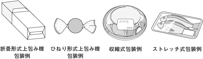 上包み形式は、包装形態から折畳形式・ひねり形式・真空吸着式・収縮式などに大別されます。