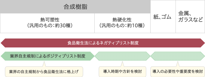 ポジティブリスト制度は、熱可塑性の合成樹脂からスタートし、熱硬化性の合成樹脂や紙、ゴム、金属、ガラスなどに段階的に適応させていく予定です。具体的な物質については、ポリオレフィン等衛生協議会、塩ビ食品衛生協議会、塩化ビニリデン衛生協議会のポジティブリストを参考にしてください。