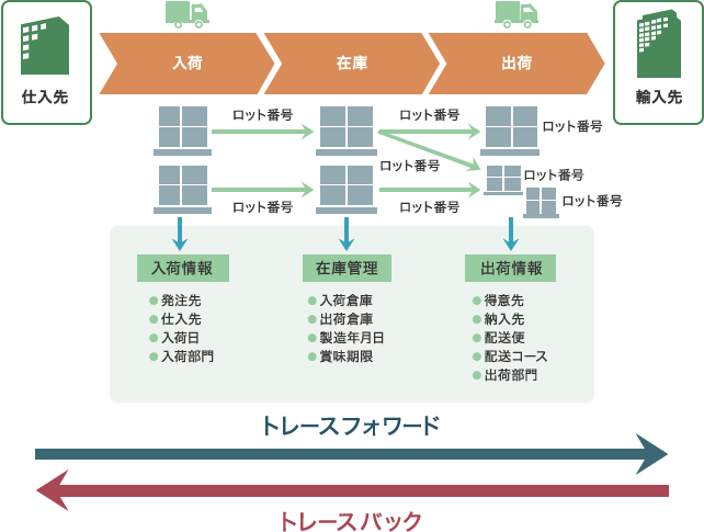 | 受入先の情報(受入記録) | 製造・加工の情報(内部工程記録) | 出荷先の情報(出荷記録) |