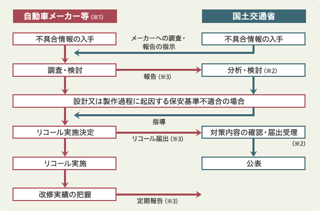 日本のリコール制度は道路運送車両法に基づいて、完成車メーカーが販売店などに寄せられた苦情や事故情報をもとに原因を究明し、自らの判断で国土交通省に届け出ますが、部品や構造に問題があればリコール、構造自体に問題はないものの安全確保が難しい場合は改善対策、商品性や品質を確保するためにメーカーが自主的に無償修理するサービスキャンペーンというように3段階の対策が取られるのが通例です。