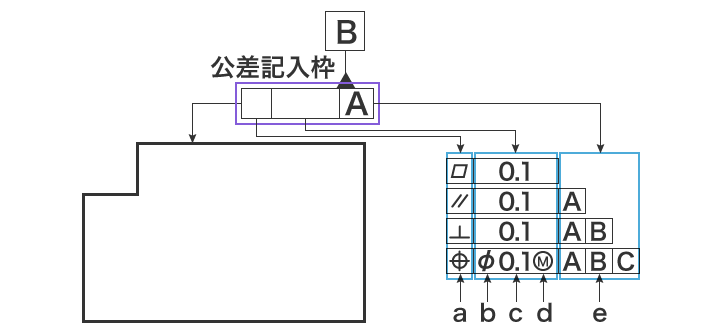 - 設計者が優先して基準にしたい部分をデータムとして指定する。複数のデータムを指示する場合は、左から右へ優先順位が高い順に記入する。