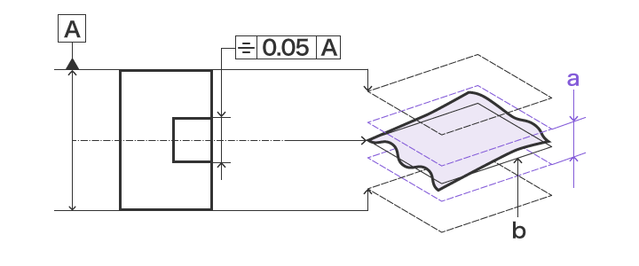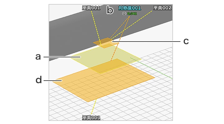 「データム(基準となる平面)に対して対称であること」という対称度の精度を測定します。