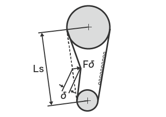ベルトの適切な張りは、スパンとたわみ・張り荷重で求めることができます。張りは、スパンの中央に張り荷重(Fδ)をかけ、たわみ量がδになるように調整します。タイミングベルトの場合、たわみ量は、「テンショナー(アイドラー)」といわれるローラーで調整します。
