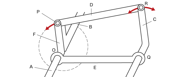 上記のように、クランク機構はクランクまたはその原理によって、回転運動を往復運動に、往復運動を回転運動に変えます。つまりクランク機構は、軸Eの両端の点(OとQ)が固定されている場合、軸Eは必要ではないということです。