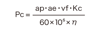 切り込み、切削幅、1分間当たりのテーブル送り量、比切削抵抗と機械効率係数から、フライス加工に必要な所要動力を求める式です。たとえば、工具鋼を