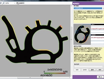 輪郭比較機能で測定した対象物の形状データは、自動保存されます。「輪郭統計機能」を使用することで、データを解析し、形状が安定している部分と不安定な部分をすぐに確認できます。また、保存された形状データの特定箇所の差異はクリック1つで測定値の確認が可能です。