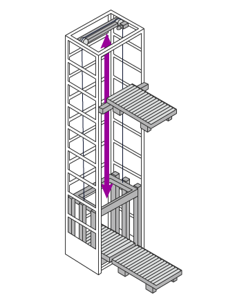 垂直搬送機とは、物流センターや工場などの建物に設置される荷物を垂直方向に搬送する装置のことです。荷物用エレベーターとは異なり、建築基準法上の「昇降機」に該当しないため、建築確認申請や労働基準局の許可や設置後の定期検査報告などが不要です。荷物の搬送に特化しているため搬送速度を速くすることができ、入庫や出庫を行う搬送装置と組み合わせることで、効率的な搬送システムを構築することが可能です。このことから、物流センターや工場などでは多く導入されています。