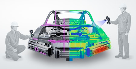 キーエンスのワイドエリア三次元測定機「WM-6000シリーズ」は、測定したい箇所に取り付けたワイヤレスプローブの位置を読み取ることで高精度な測定が可能です。