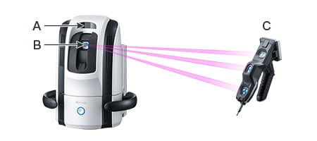 「WM-6000シリーズ」ではムーバブルカメラでプローブをトラッキングしながらプローブの位置と姿勢を高精度に認識し、プローブサーチカメラでワイヤレスプローブから発する光を常に追跡します。これにより、広範囲な測定領域のどこにプローブがいても、瞬時に位置を認識することができます。