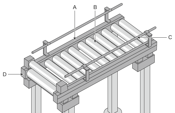 フリーコンベアにはローラータイプとホイールタイプがあり、手押し搬送や下り傾斜で使用します。 - C:ワークガイド