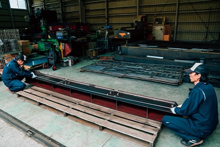製造時の寸法に誤差があると、設置後の調整に多くの工数を要し、場合によってはコンベアを工場へ回収して再度の加工・調整が必要になります。また、設置時はコンベアが正常に動作するように平行・水平などを測定しながらの調整がポイントになります。