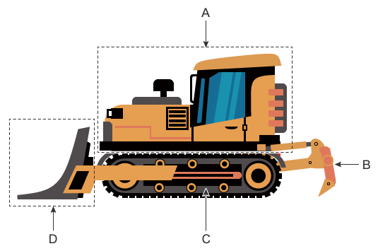 ブルドーザーは、もっともポピュラーな重機です。本体となる車体(トラクタ)に「ブレード」といわれるアタッチメントを装備しています。このアタッチメントを取り替えることで、さまざまな用途に対応できます。また、車体後部には、岩を砕いたり固い地面を掘り起こしたりする「リッパ」といわれる爪を装備しています。走行装置にはホイール(タイヤ)式とクローラー(キャタピラー)式があります。ホイール式は舗装路を走ることができるため、機動性に優れています。一方、クローラー式は接地面積が大きいため、軟弱地や不整地、傾斜地でも走行できます。また、クローラー式は牽引力も大きいので主に土工事に用いられます。
