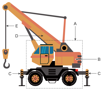 カウンターウェイトは、作業時の機体の安定を良くするために車体後部に取り付けられているおもりです。カウンターウェイトには作業に応じて重量を追加するタイプがあり、カウンターウェイトの重量とアウトリガの張り出し幅の組み合わせによりA性能、B性能などの定格総荷重があります。